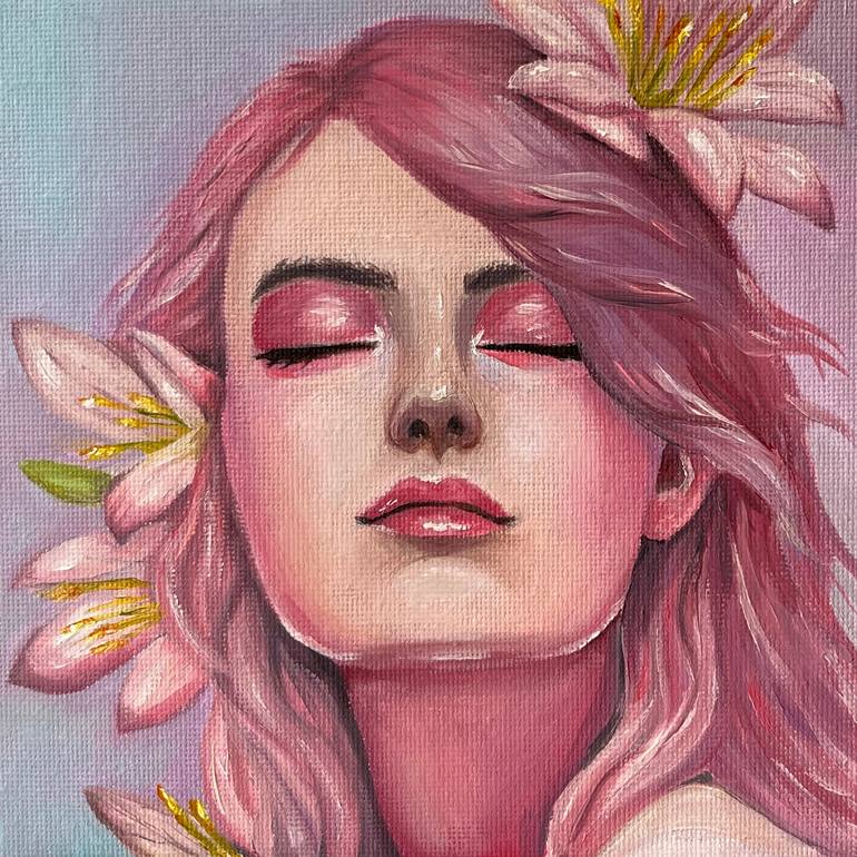 A beautiful girl with pink hair enjoys the scent of lilies. Inspired by the coming of spring