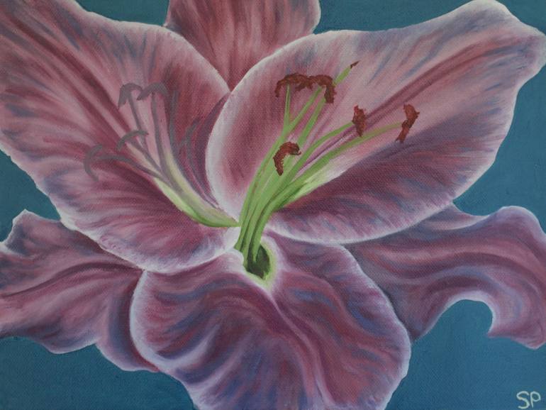 This floral study draws us intimately into the centre of a lily, exploring colour, form and texture. The background balances warmth with coolness, and adds a vibrancy to the flower. Unframed canvas board.