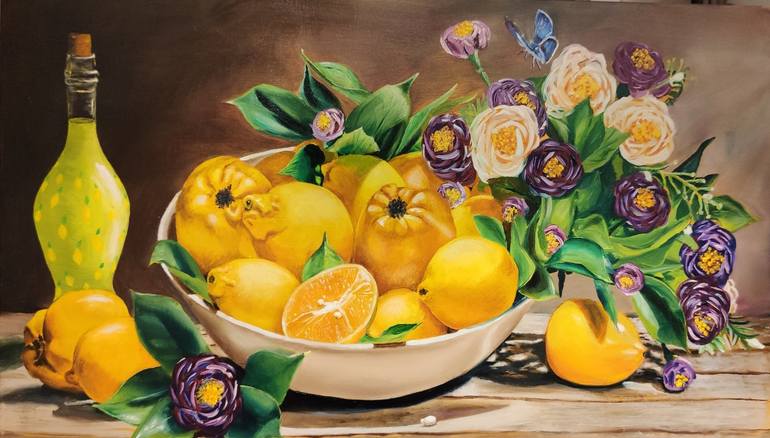 Liqueur (Limoncello) an alcoholic drink that welcomes the sun and the light, the scent and the rich flavor of lemon. Hand painted picture with high quality, lightfast colors. High quality cotton canvas, stretched on a wooden frame and ready to hang on the wall. The edges of the canvas are painted. ...