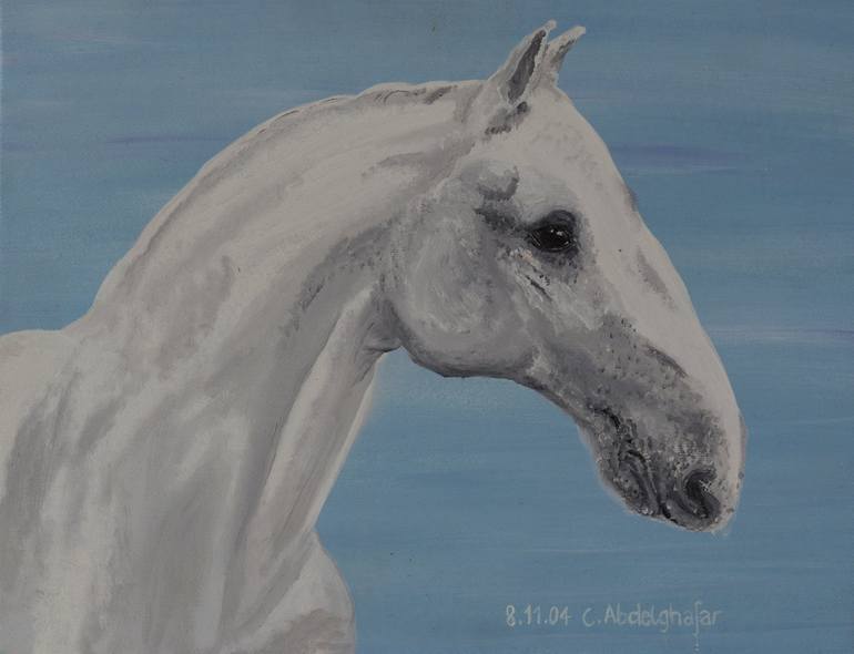 This oil painting shows the portrait of a Lippizan stallion against a light, blue background. The horse is depicted in profile, with its head and part of its neck visible. The depiction of the horse is realistic and detailed. The white coat is painted with fine shading and grey tones, giving the ani...