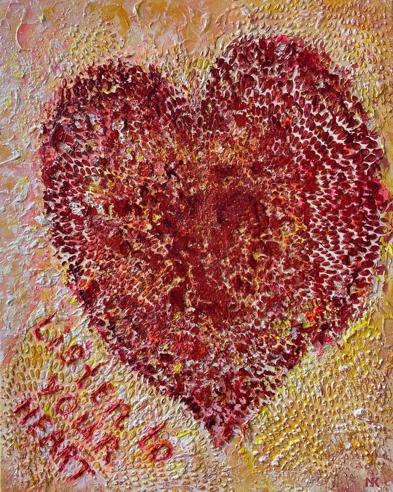 In this passionate semi-abstract acrylic painting, I explored the depths of emotion and connection. Central to the piece is a vivid red heart, textured and intense, symbolizing the raw, pulsating emotions of love and life. The surrounding golden hues represent the warmth and light that love brings, ...