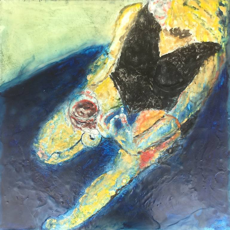 Encaustic on birch panel. She had a way of scratching at the cuticle of her thumb when she was nervous, or wanted something, or both. Sitting on the bed and drinking wine in that little black dress.