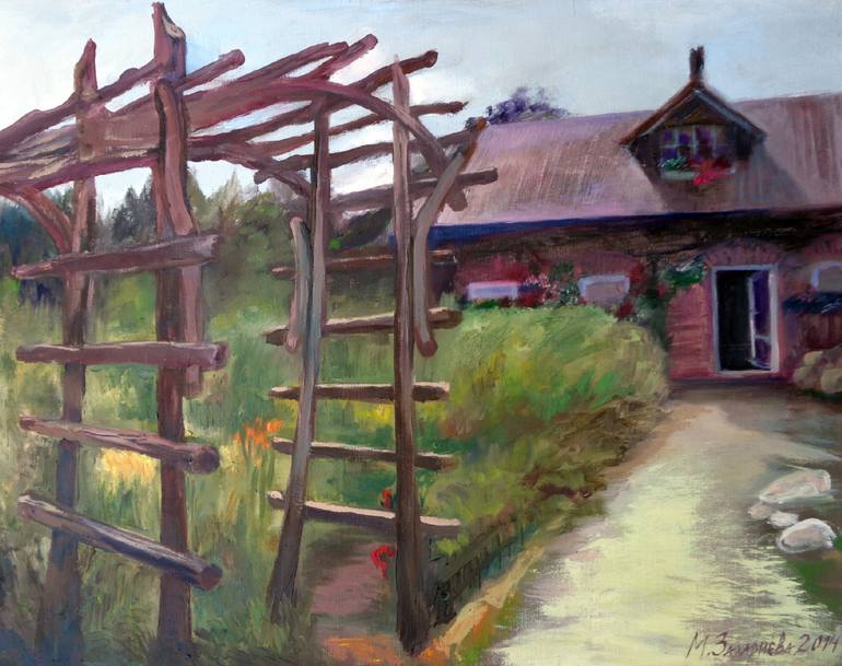 This original oil painting captures the serene beauty of the Polish countryside. Painted on canvas, the artist's impressionistic and expressionistic styles blend to depict a charming house nestled in Łazy, Miechów County, Poland. Sunlight bathes the scene, illuminating the vibrant garden and creatin...
