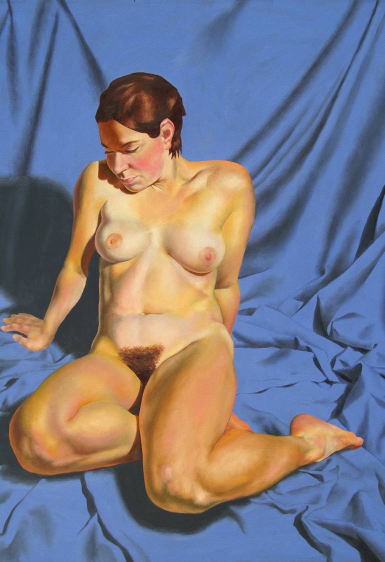 Some people tend to gravitate to the folds of the draped fabric in this painting while others are more attracted to the many variations in the flesh tones. Each of the colors you see in the flesh were actually there on the model's body. The blue color of the background makes the flesh tones appear p...