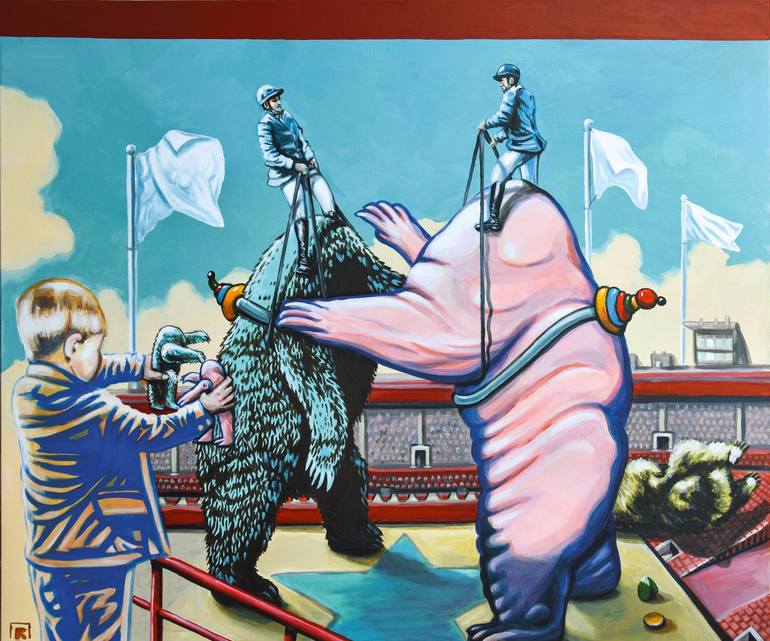 From a box seat you can see an arena in which two bearish colossi without heads fight each other. Two jockeys stand on top of the beings and lead them with thick lines, they become the heads of the massive bodies. A spectator stand is indicated in the background. In the foreground on the left, a boy...