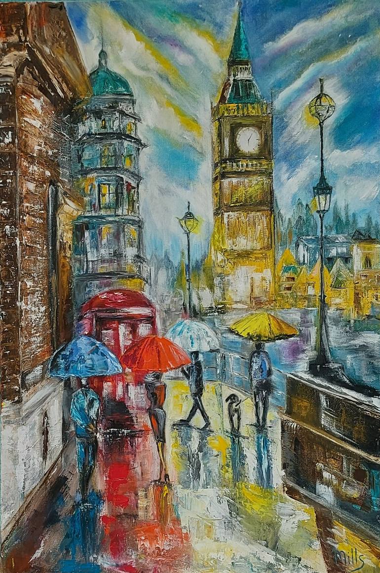 Oil Painting On Canvas by palette knife London Cityscape. This oil painting on canvas captures the essence of the rainy city in impressionist style. The intricate pallet knife techniques and vivid colours depict a London landscape with the Big Ben, as people leisurely stroll through the streets and...