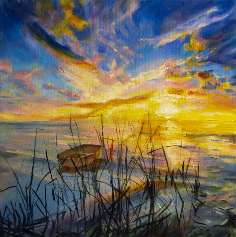 original oil painting on canvas "Lonely boat" 50*50 cm.