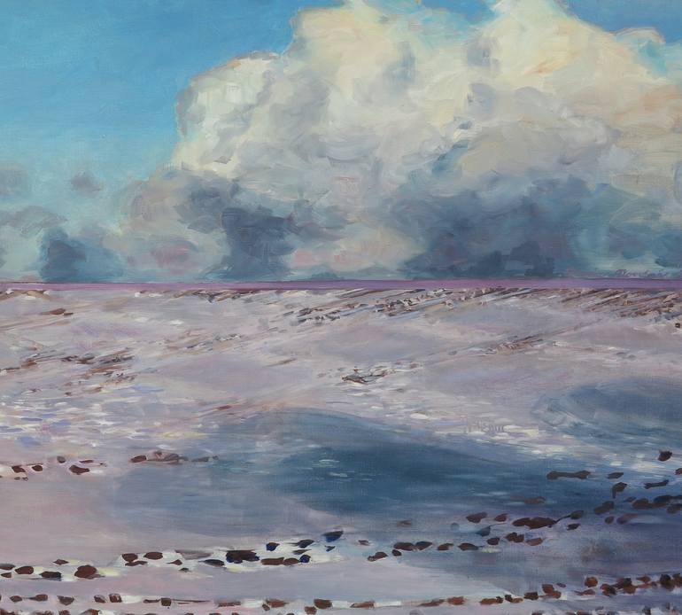 The winter walk caused this image. At sunset, the snow turned unusually pink and the long shadows of the trees and traces of game completed the motif. Painting on canvas