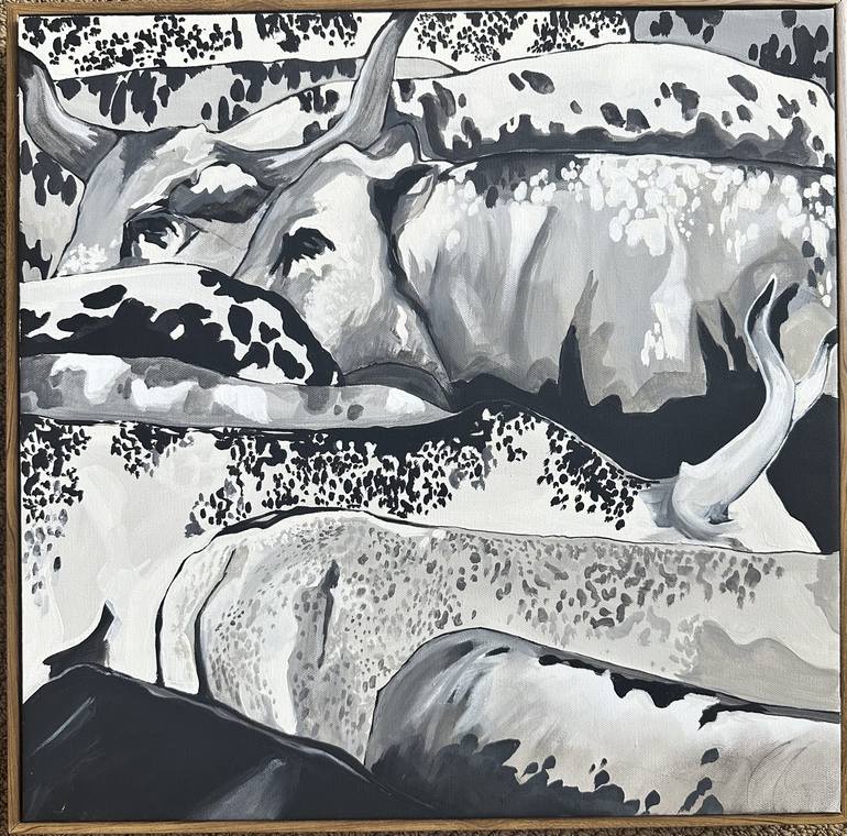 Seeing the dots and patterns on cows from a new perspective. A close up of their body with numerous dots cut by lines of closely standing outline of cattle is simply beautiful.