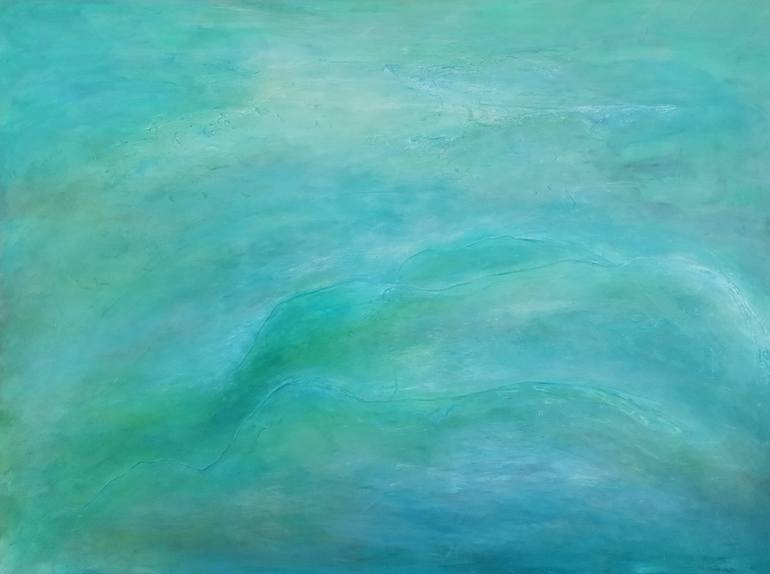 This is a monochromatic painting that subtly shows the sea. Gently rolling waves, turquoise-green water. Hardly anything can be seen exactly, which accounts for the enormous calm that this image creates. The waves are indicated by lightly structured lines, and sections that show the texture of vario...