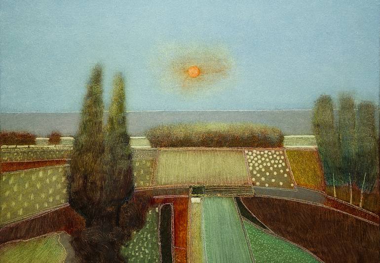 Landscape painting with a setting sun. Lots of color and depth.
