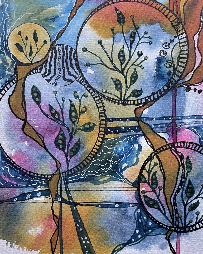 I was freezing! I needed to do something to take my mind off the cold so, I pulled out the watercolors and pens. Starting with an abstract watercolor I added circles, straight lines and meandering lines as well as leaves and twigs to give the painting a organic feel.