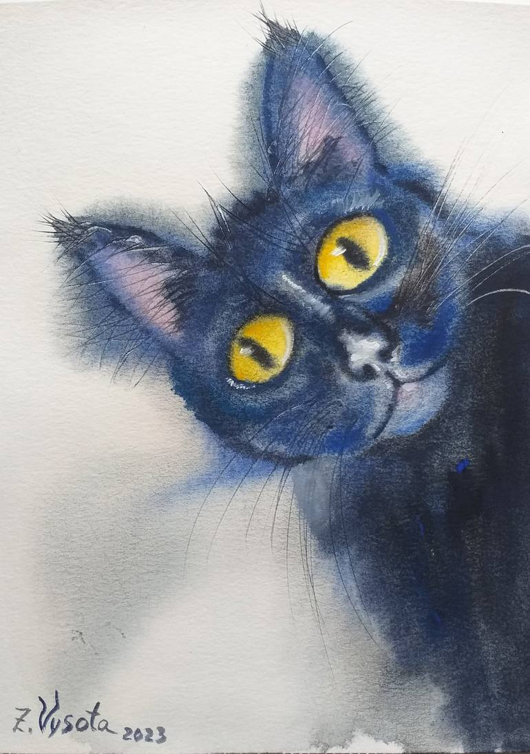 --- Looking for a cat. A black cat peeks around the corner looking for company. --- This unique and exclusive watercolor painting, hand painted on 300gsm 100% cotton watercolor paper. --- Wonderful idea to decorate your home, living room, dining room with a contemporary style. --- Picture is...