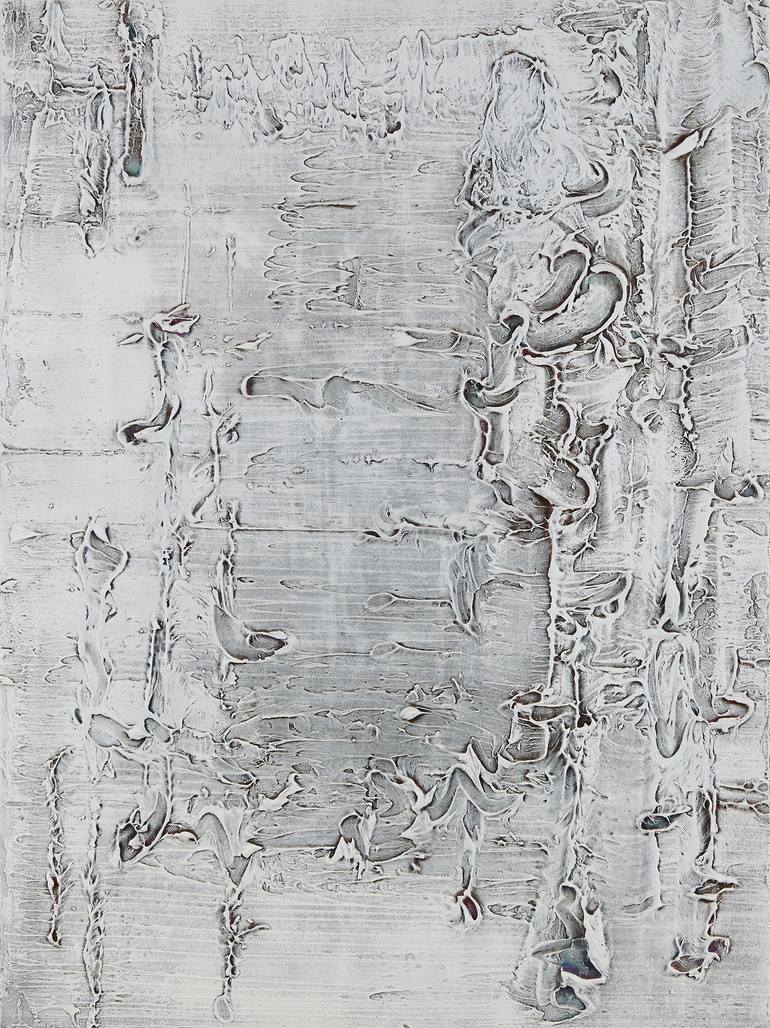 This intriguing painting practically glows from within. It actually looks like molten silver when the light rakes across its deep textures. Created of plaster and various paints, painted in many layers, its history is revealed in areas all over the canvas. Bits of colour emerging from the layers of ...