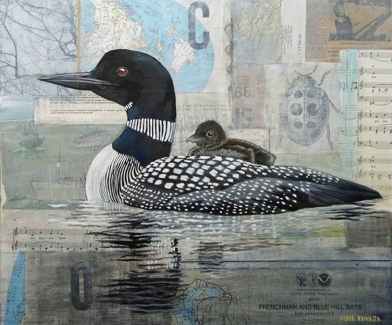 Common loon with chick acrylic painting on a background of vintage paper collage on birch plywood. Edges painted black, varnished and ready to hang.