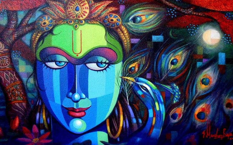 This painting is the depiction of lord Krisna and his peacock from my imagination at his beautiful and calm form.