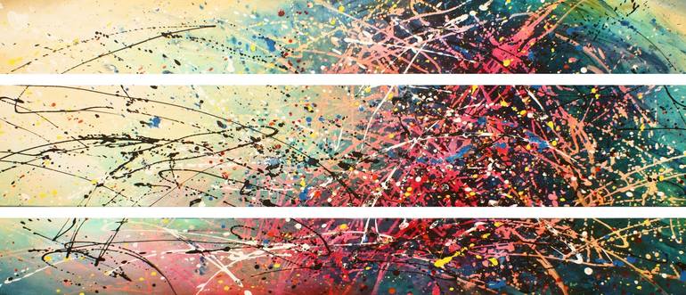 A three piece painting, center piece is 12" x 72" and the two outside pieces are each 8" x 72, with 1.5" spacing giving a total of 31" x 72".This was inspired by the great deal of time I spend watching sunsets and the shoreline and every time I think that each is beautiful unique, lasts for only a ...