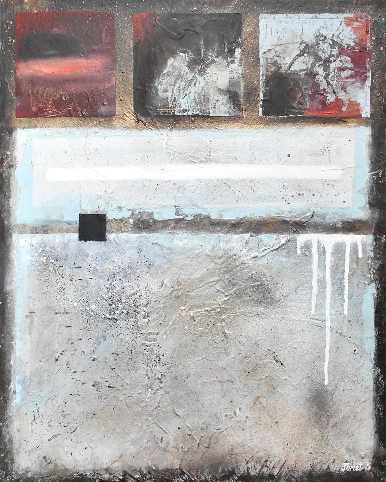 'Lost Line' is an highly textured, abstract work of art in acrylic medium on deep edge canvas. Strong contrasting colours with tones of red, black, duck egg blue and sky blue come together in harmony to represent a loose, geometric design creating great impact for the viewer. Gold paint has been app...