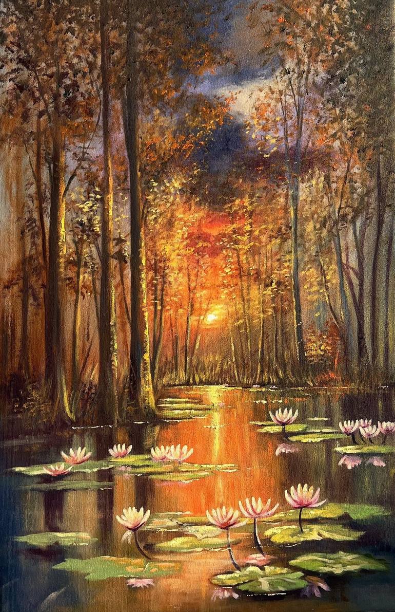Lotus Romance with Sunset is a captivating portrayal of nature’s serene beauty, where delicate lotus flowers bask in the warm glow of a setting sun. The soft hues of the sunset reflect on the calm water, creating a harmonious blend of colors that evoke feelings of peace and tranquility. This paintin...