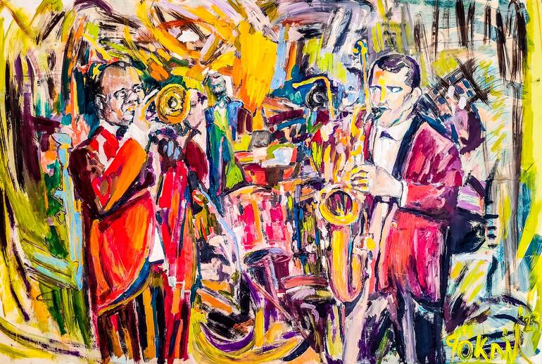 This vibrant oil painting by Göknil Gümüş Sungurtekin is a tribute to Louis Armstrong and Eddie Shu, capturing their performance of Hello Dolly. The artist translates music into color, rhythm into movement, and sound into visual form, creating an expressionist composition that pulses with energy. B...
