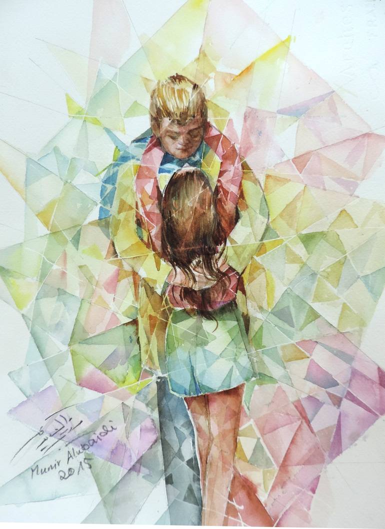 A geometric- abstract watercolor shows two lovers. This watercolor is unframed