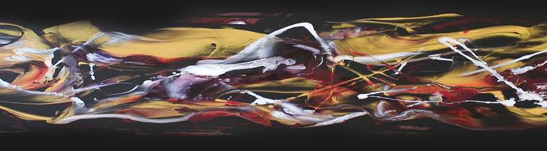 Original painting Abstract expressionism Free style painting Acrylic on canvas Inspired by the beauty of nature, forest, dreams, sense of freedom Gold, red and white splashes of colour on deep black background Abstract landscape inspired by Jackson Pollock Sides are painted Signed and stapled on the...