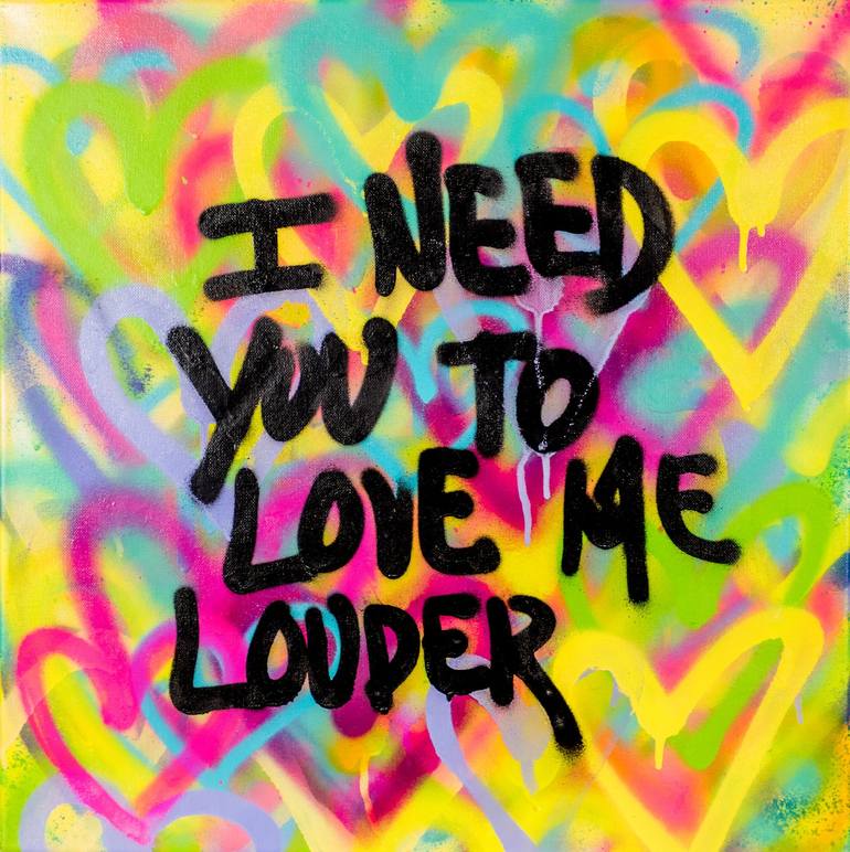 Part of the 'Love me louder' series, this is a bright and colorful reminder. Spray paint on canvas, signed.