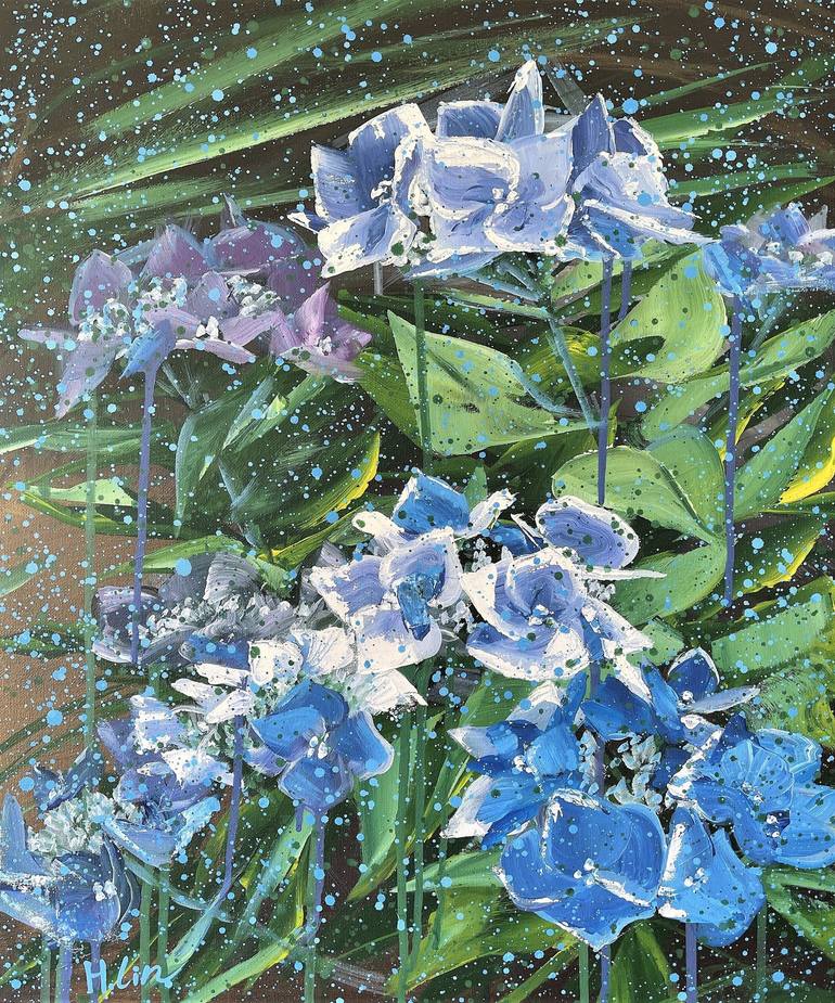 Love Struck – Blue Hydrangea 60 x 50 x 3.5 cm 07/02/2022 By HSIN LIN Metallic Gold paint are used in undertone. It shines beautifully when you look at the physical painting. Acrylic on Acid-free canvas. Painted with palette knife and brushes. Sealed with clear spray varnish. Side panels painted. Si...
