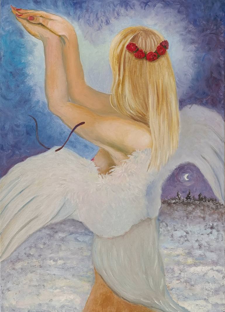"Love Will Find a Way" is a 70x50 cm oil on canvas painting that captures the transformative power of love. The artwork depicts a young woman in a side profile, her face hidden from view, her posture suggesting a graceful swan-like neck and head, adorned with a wreath of red roses. Her hands are cla...