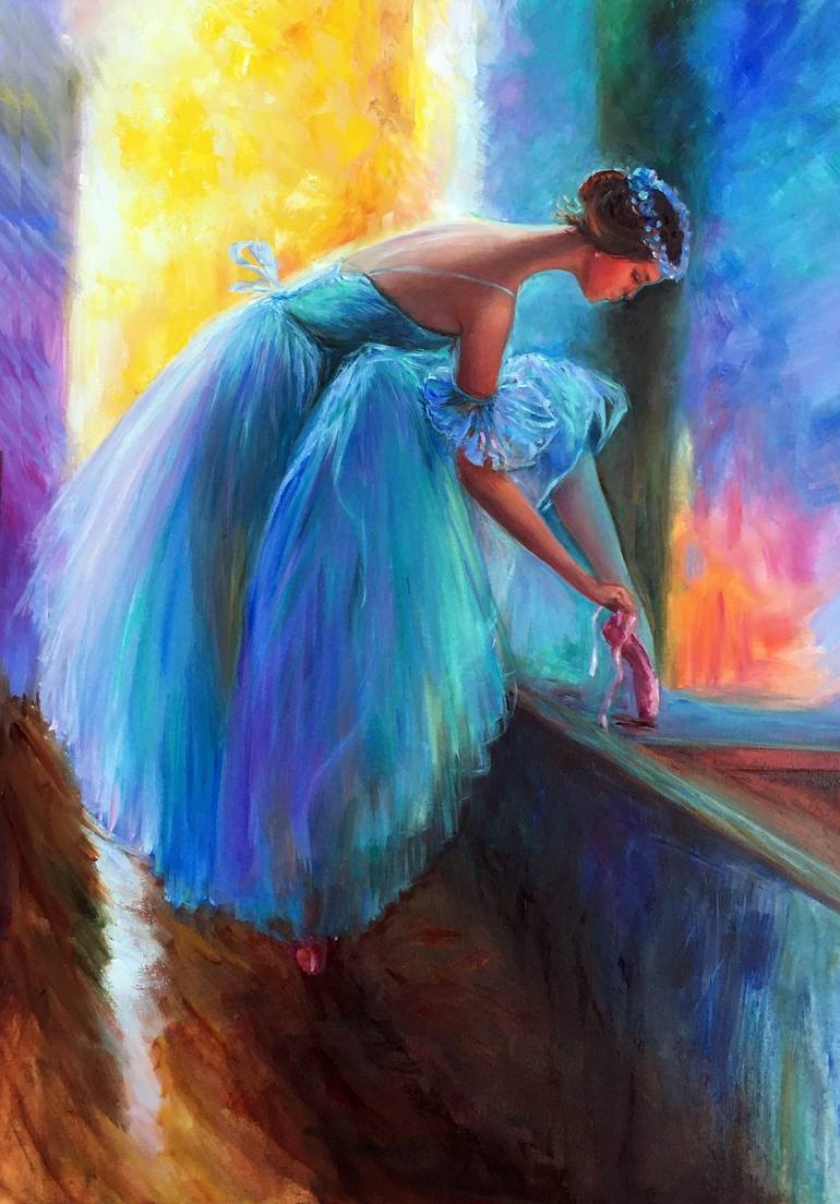 I am very pleased to share my latest painting of a young dancer gracefully standing before going on stage. Her graceful pose perfectly conveys a wonderful combination of tension and calm, and her shimmering dress emphasizes her elegance and flexibility. Just a moment more and she will spin in a capt...