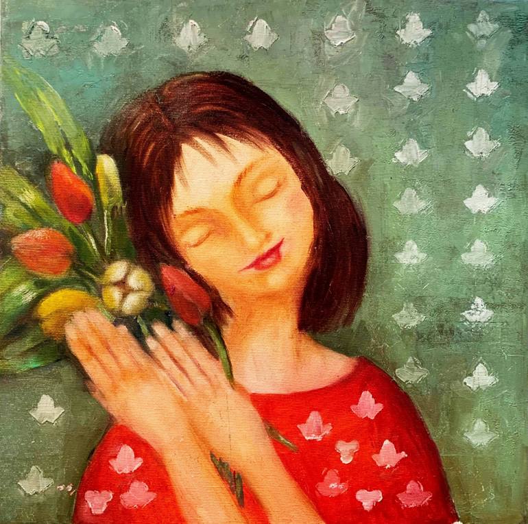 Whispers of Spring is a tender and emotive painting that captures the quiet joy of connecting with nature. A serene female figure, eyes gently closed and lips curved in a peaceful smile, embraces a vibrant bouquet of spring flowers. The composition radiates warmth and tranquility, brought to life by...