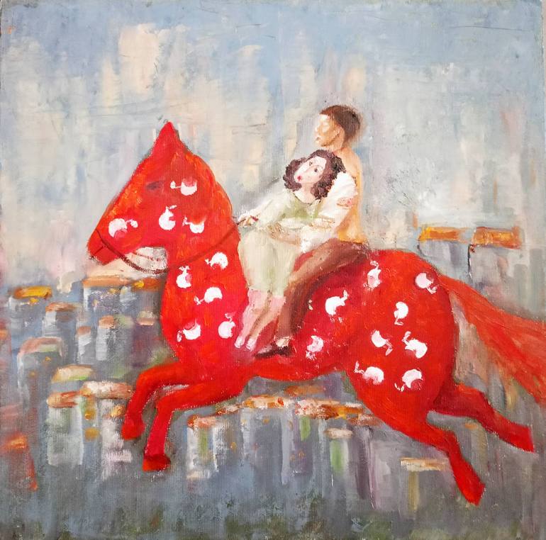 This painting presents an ethereal and dreamlike scene, featuring a couple riding a vibrant red horse adorned with irregular white spots. The horse seems to defy gravity, galloping through a hazy, urban-inspired backdrop. The cityscape is rendered abstractly with muted tones of blue, gray, and hints...