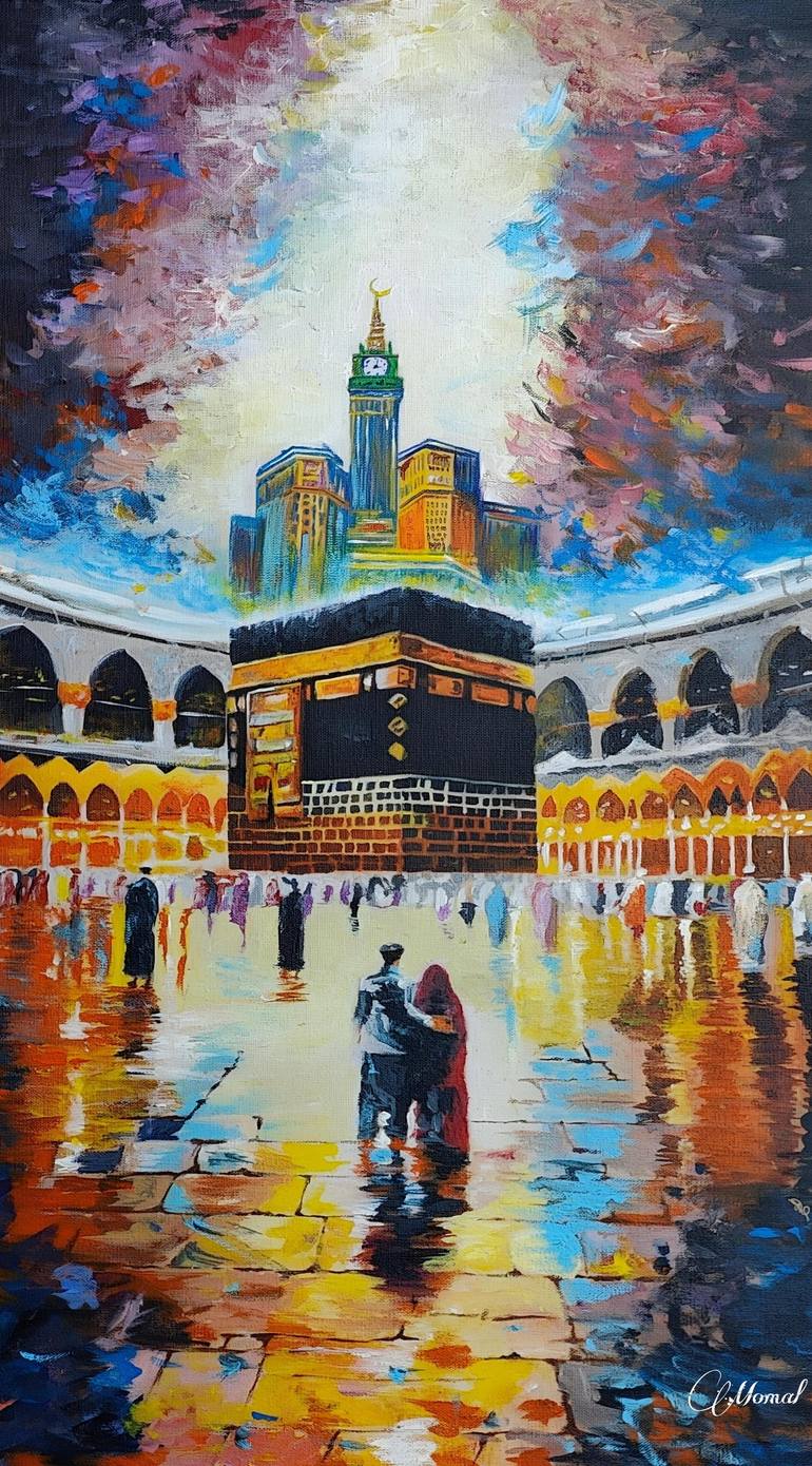 This painting is a visual narrative of faith, devotion, and the profound connection between two souls. The centerpiece is the Kabba, the holiest site in Islam, standing majestically against a backdrop of dramatic, swirling clouds. The vibrant colors evoke a sense of spiritual energy and the awe-insp...