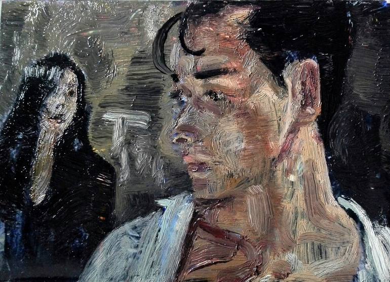 Love, oil painting on paper. Love young man and girl oil painting.