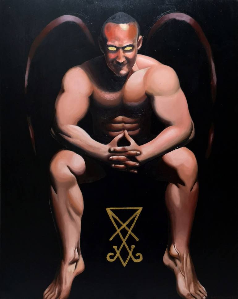 Here is Lucifer, sitting silently with a mischievous smirk on his face, indicating a certain victory. His gaze is directed at the viewer, and this can be an indication of what his victory consists of. His wings are slightly apparent in the dark, and his eyes are glowing with bright yellow golden ...