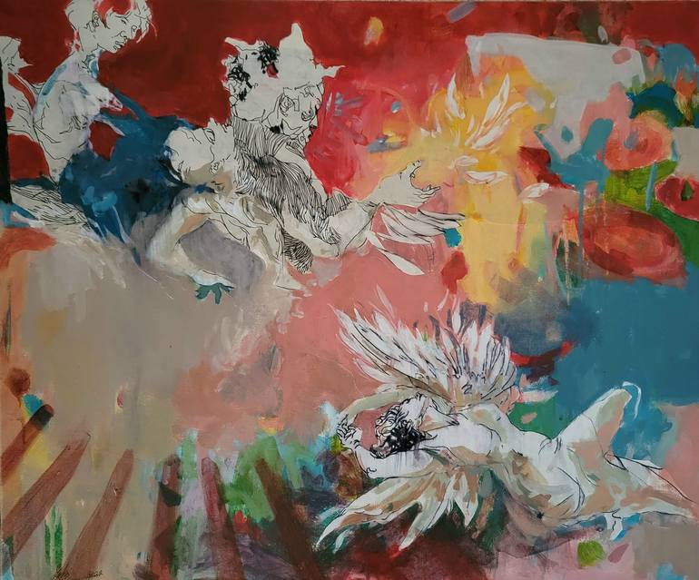 The "story" of creation, heaven and hell and devil has been always an intriguing subject for me. In this piece, I'm narrating my version of angels and their rejection. This artwork is painted with acrylics, collage and finished with a coat of semi gloss varnish.