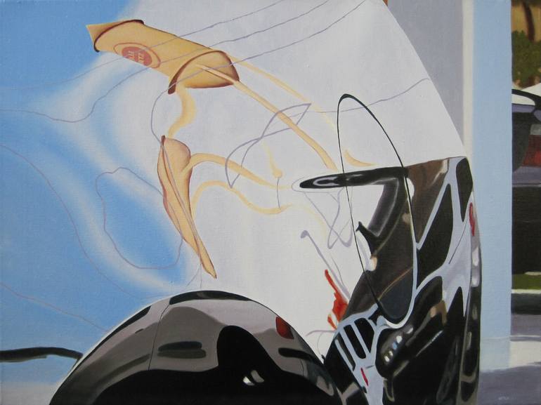 It's a late-model Ford Mustang GT, not that that matters. The reflections include the Lucky Strike water tower in downtown Durham. Oil on linen, includes a black wooden floater frame.