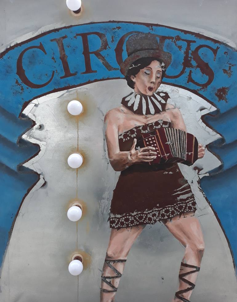 Lucy is a Clownlady. Whistling and practising for her next show she stands in front of the old, rusted circus banner, not questioning her life and going forward step by step. This series of steel paintings is called "Bis dass der Rost uns scheidet - Nichts ist für die Ewigkeit." (Until rust devides...