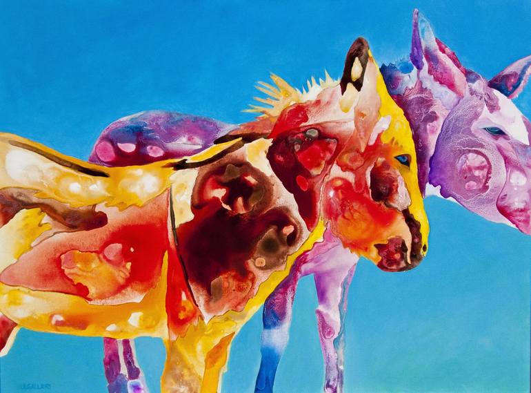 I photographed these donkeys in north Scottsdale, AZ and I knew I wanted to paint them. I want the viewer to see the fun in the painting of the acrylic and ink interacting on the canvas. I love horses and I love donkey ears. This is a pouring technique I have experimented with for years.