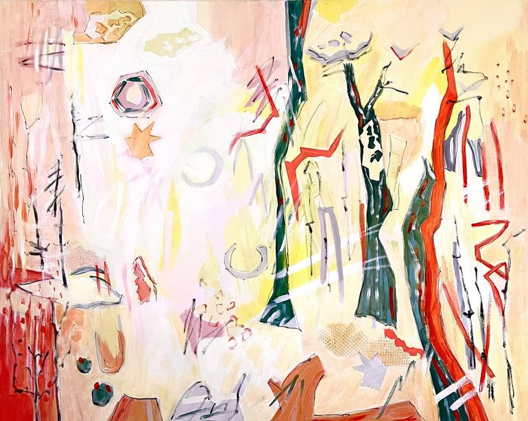 Eliane Saheurs traded one homeland of spectacular mountains for another, and found her artistic voice between ancient stability and endless change. Landscapes, variously abstracted, are her muse, and they crackle action and life. What the viewer sees is up to the viewer, as Saheurs, even at her most literal, makes no orders. Her scale and perspective fire the imagination, and only the artist’s reverence for our rugged land is indisputable. by Peter Simpson March 2021 Eliane Saheurs came to painting through an early introduction to photography, where unexpected things happen in the process of making art, and sometimes make everything better. When a young Saheurs worked with her father in his darkroom, and later in the field and darkroom with her mineralogist/geologist husband, she would have seen how curious shapes appear on fresh prints — those small but larger-than-life echos of dust, an eyelash hair, a smudge on a lens, or a tiny, Cohen-esque crack where the light gets in. The shapes were blemishes, but a blemish can beautify, like the right scar in the right place on the right face. Those serendipitous glitches may have later inspired Saheurs, for such shapes energetically populate her paintings. Here it is not their origin but their purpose that’s inscrutable; who knows what intent is buried in those shapes, what emotions fire those vivid colours, what desires fuels those tireless motions? You can be certain only that the shapes are busy, at times frenetic in their energy, as they spin and fly in all directions. Saheurs was born in Thun, Switzerland. She moved to Canada — trading one homeland of spectacular mountains for another with its own backbone of rock — and eventually she found painting as her artistic voice. She moved to Ottawa in the 1980s and began a decade of study at Algonquin College and the Ottawa School of Art. She worked with names well-known in Ottawa — Blair Sharpe, Kathy Gillis, Jeff Stellick and others — and studied with artists who hailed from New York to New Mexico to Austria to Tokyo. Her work was included in Saatchi’s “Best of 2017” catalogue. It also hangs in the City of Ottawa’s collection, and in private collections across the city’s corporate, legal, political and diplomatic offices — including, not surprisingly, the Embassy of Switzerland.