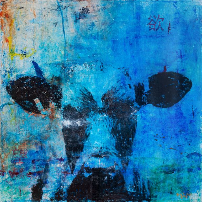 Lust is one of seven deadly sins which is represented by the cow for being a shameless animal. On the upper right and lower left of the painting, are the Chinese words 欲望, the verb form of 'lust'. Written on the upper left side is the inscription 'They are in the very wrath of love, and they will to...