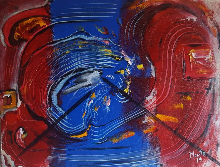 M-THEORY IS, IN MY MINDS EYE, A VIEW OF A COMPLETE UNIFIED THEORY. A MULTI-DIMENSIONAL MULTIVERSE WITH TEN SPATIAL DIRECTIONS AND ONE DIMENSION OF TIME. (OIL ON CANVAS PAPER).