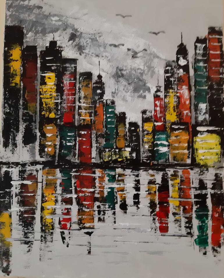 Obra inspirida en Manhatan, de colores vivos, moderna.