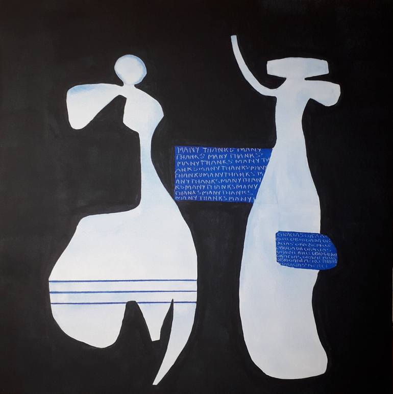 JE REPRENDS 2 PERSONNAGES QUE JE FAIS DIALOGUER. ACRYLIQUE SUR CHASSIS CARRE 80X80 CM Winsor & Newton. PERSONNAGES BLANC LEGEREMENT BLEUTE sur FOND NOIR. 2 ESPACES AVEC UNE CALLIGRAPHIE GRATTEE REPRENANT LE TITRE DE LA PEINTURE, en ANGLAIS, ESPAGNOL, PORTUGAIS, ITALIEN, FRANCAIS. MOT INDISPENSABLE A...