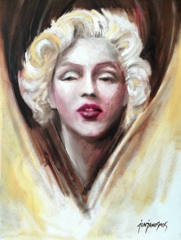 The late American icon and Hollywood actress Marilyn Monroe is captured with a limited palette in oil with her blond locks.
