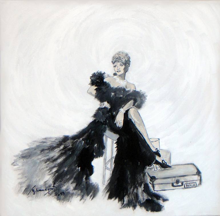 Painting "Icons & Legends" I had to paint MARLENE DIETRICH too. She's wearing a beautiful evening dress and she looks very relaxed. Maybe a bit bored? She shows her beautiful legs. But - for whom is she waiting? There's a suitcase on the right side of the painting. It says: BERLIN. Think about her ...