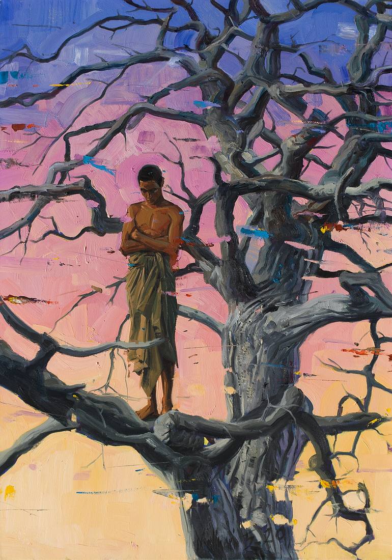 the tree as a link between earth and sky, means of connection and elevation, a condition of poetic light, and a young man in meditation, with a painting that mimics the passage of time, and the continuous transformation of things