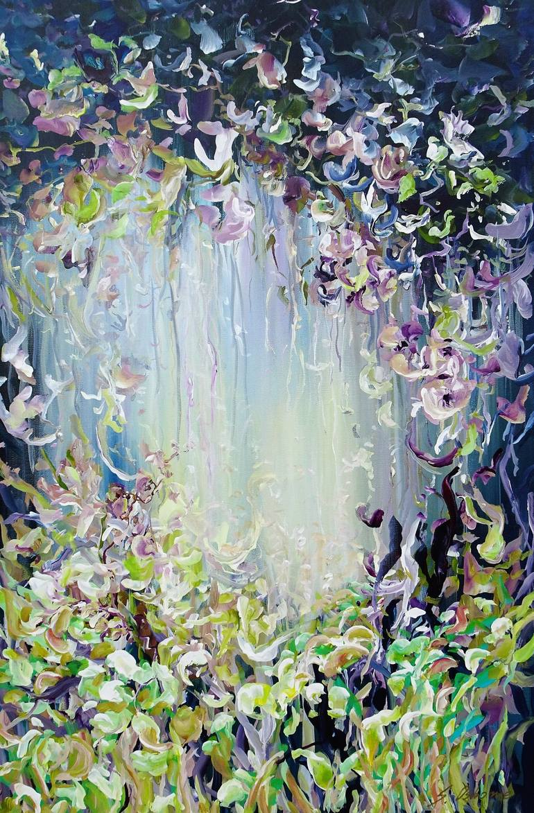 The painting inspired by my Florida tropical floral garden. There are so many incredible flowers - strikingly beautiful orchids, bird of paradise flowers, exotic trees, bromeliads and palm trees in my tropical garden. About the process: This piece was started with no preconceived notion of how the ...