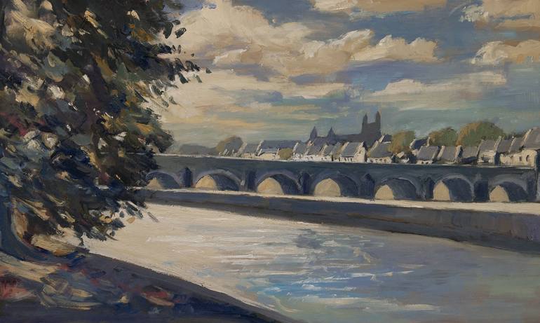 The beautiful capital of the Dutch province Limburg is Maastricht. Seen here from Wyck at the East bank of the river Meuse or Maas. A great impressionistic fine art piece in oil colors. Painted on wood, en plein air.