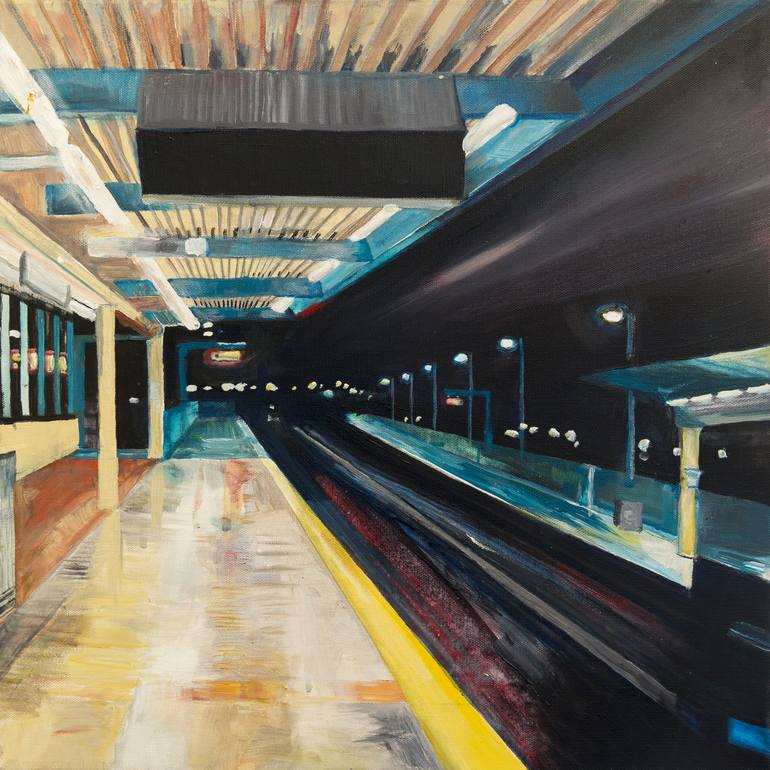 The Inspiration for this painting was a photograph I took in the early hours of the morning on a deserted train platform in Oakland, California. It alludes to themes of loneliness, isolation, nostalgia, uncertainty and the great beyond. Through the language of the media itself I seek to evoke a fell...